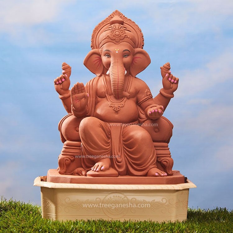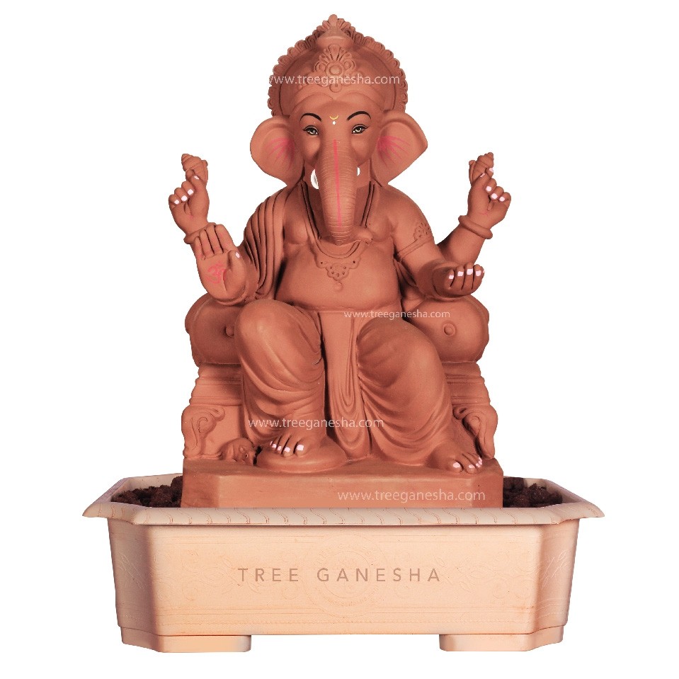 Made from red soil, natural colors, and seeds, this plantable Ganesha idol grows into a plant after visarjan.